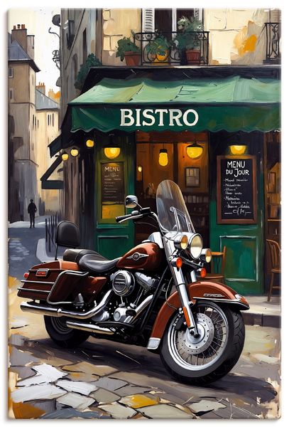Eine parkende Harley vor einem Bistro Wandbild